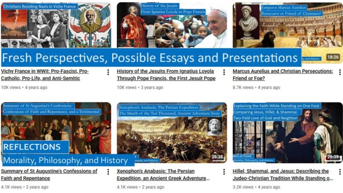 Roughly speaking, the order of the reflection summaries in this listing is determined roughly by my guess about what will pique the editors’ interests, and which reflections have the most views. Most YouTube reflections have blogs with footnotes, and SlideShare Adobe files from my PowerPoint scripts with public domain paintings and photographs. My Channel Philosophy reflection also introduces the themes behind many reflections.